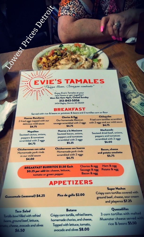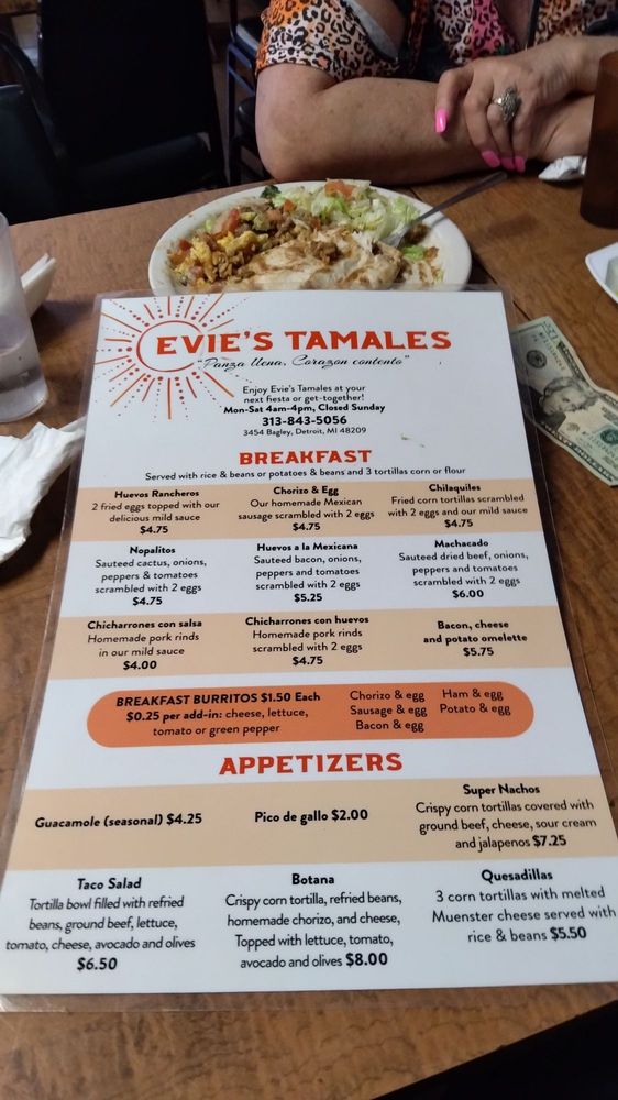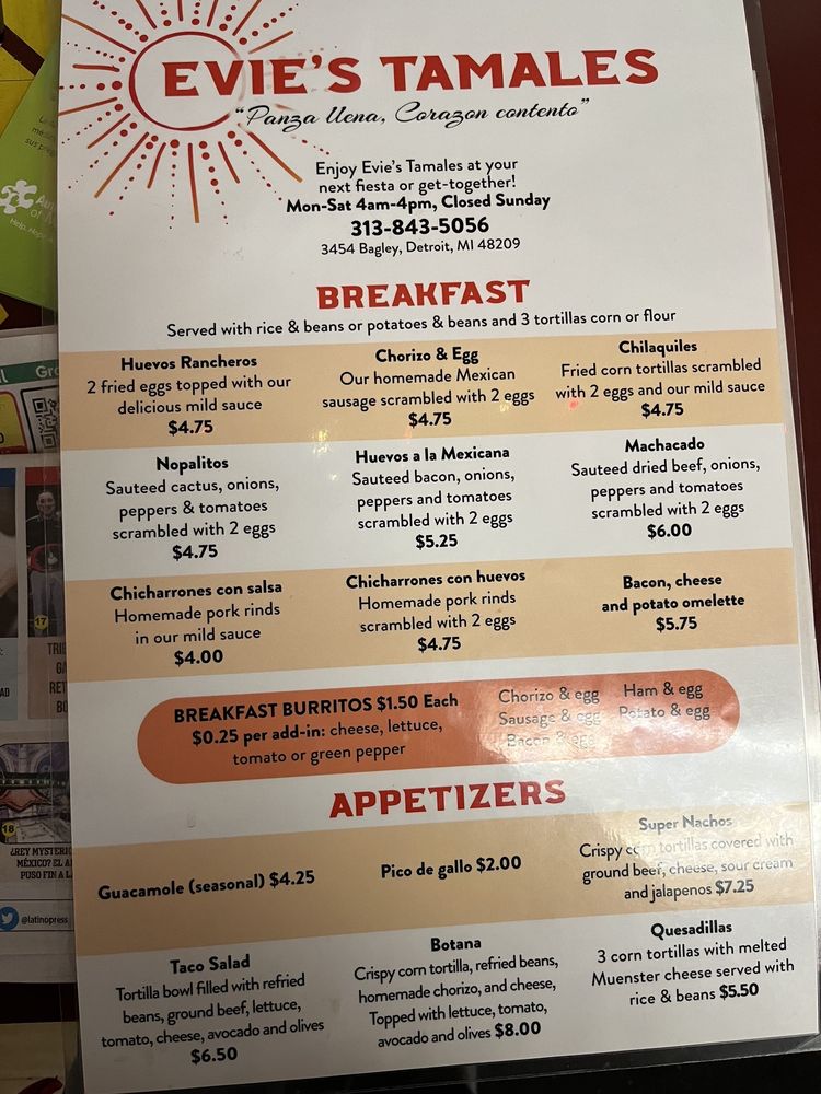Evie’s Tamales in Detroit, MI, is a hidden gem in Mexicantown offering a variety of Mexican dishes. The menu features appetizers like Guacamole, Taco Salad, Botana, and Super Nachos, as well as Ala Carte options like Tacos, Burritos, and Enchiladas. Customers rave about the tamales, with reviews praising the moist and flavorful tamales. The breakfast options are a standout, with dishes like Chorizo with scrambled eggs and Chicharrons con Huevos receiving high praise for their taste and affordability. The cozy atmosphere and excellent service make it a must-visit spot for authentic Mexican cuisine. Whether you're a local or just passing through, Evie’s Tamales is a place where you'll find quality food at reasonable prices.